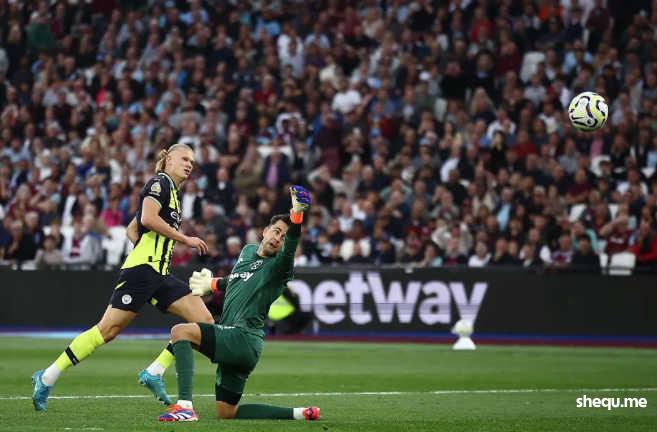 哈兰德也顺势杀死了比赛:从禁区弧顶高速启动的他甩掉整条西汉姆防线,面对被换上场的法比安斯基从容挑射建功。进入尾声,这场格外开放的对决仍然不乏亮点,放弃出击坚守小门的法比安斯基,拒绝了哈兰德上演大四喜,而零封奖已经泡汤的埃德松,则用极限舒展扑救,将萨默维尔瞄准10分角的兜射扑在了横梁上。