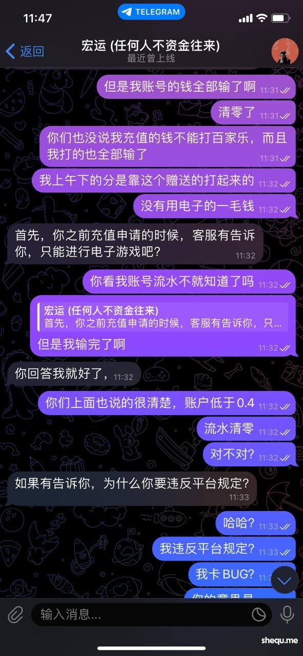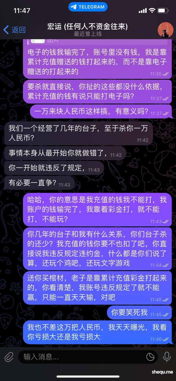 说凌晨我上的分赠送的彩金没有打10倍流水,但是平台上已经说的很清楚了,账户中资金低于0.4需要打流水的话就清零,无需打流水。但是下分用这个理由卡我,说我违规操作,那按你这个傻逼客服的道理来说,平台送我的钱我输了,我再充值上分打赢了也不能提款?因为电子流水不足?随意操作控制单个账号输赢,随意风控账号不能进入游戏,找飞机客服虽然最后把钱给我下了,但还一直嘴硬说是我违规操作