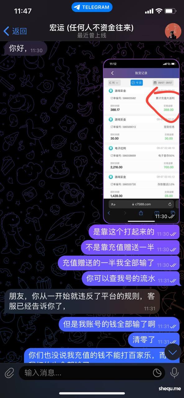 一个星期打了86万流水,前期给点小利,然后当猪杀,转转50转一下,连转50次中几十块钱,今天凌晨上了200U,客服给了百分之50反礼,要求打电子10倍流水,然后去打输没了,早上起来打开平台看见平台赠送388累计充值赠送奖励,这个钱是什么都可以去打的,我用388赠送去打百家乐赢了1万人民币,下分提款说我违规操作