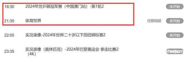 CCTV5+是国际田联钻石联赛和美网男单决赛重播;奥林匹克频道是巴黎奥运会游泳和女子曲棍球半决赛实况录像。